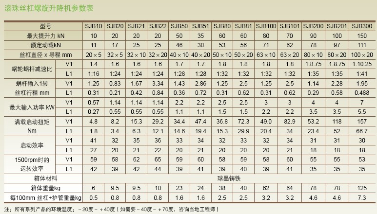 SJB系列滾珠絲杠螺旋升降機(jī)產(chǎn)品的壽命主要由滾珠絲杠的壽命及蝸輪蝸桿等零部件壽命決定;我們主要校核滾珠絲杠的壽命,蝸輪蝸桿會(huì)有磨損,但壽命一般比滾珠絲杠長(zhǎng)。滾珠絲杠的預(yù)期壽命L10是90%的滾珠絲杠在金屬材料疲勞失效前所能達(dá)到或超過(guò)的運(yùn)行距離。單位為百萬(wàn)毫米。滾珠絲杠預(yù)期壽命L10并非是保質(zhì)承諾,同時(shí)壽命的預(yù)期要在正確的維護(hù),無(wú)污染物和正確的潤(rùn)滑。